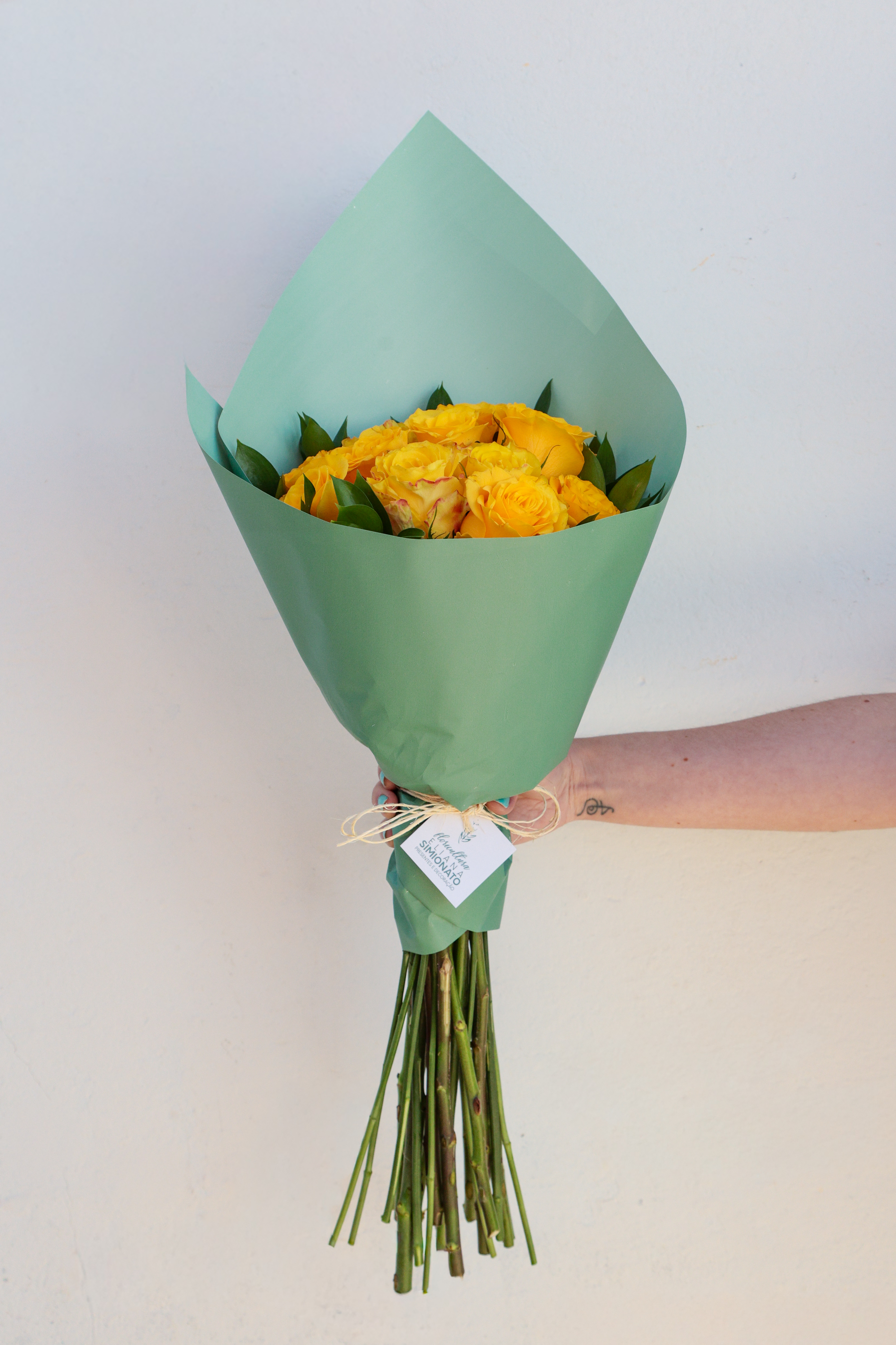 O Buquê com 12 Rosas Amarelas da Linha Clean da Floricultura Eliana é alegre, sofisticado e radiante. Suas flores transmitem amizade, luz e felicidade, combinadas ao ruscus e embaladas em papel verde moderno e elegante. Uma escolha cheia de energia positiva.