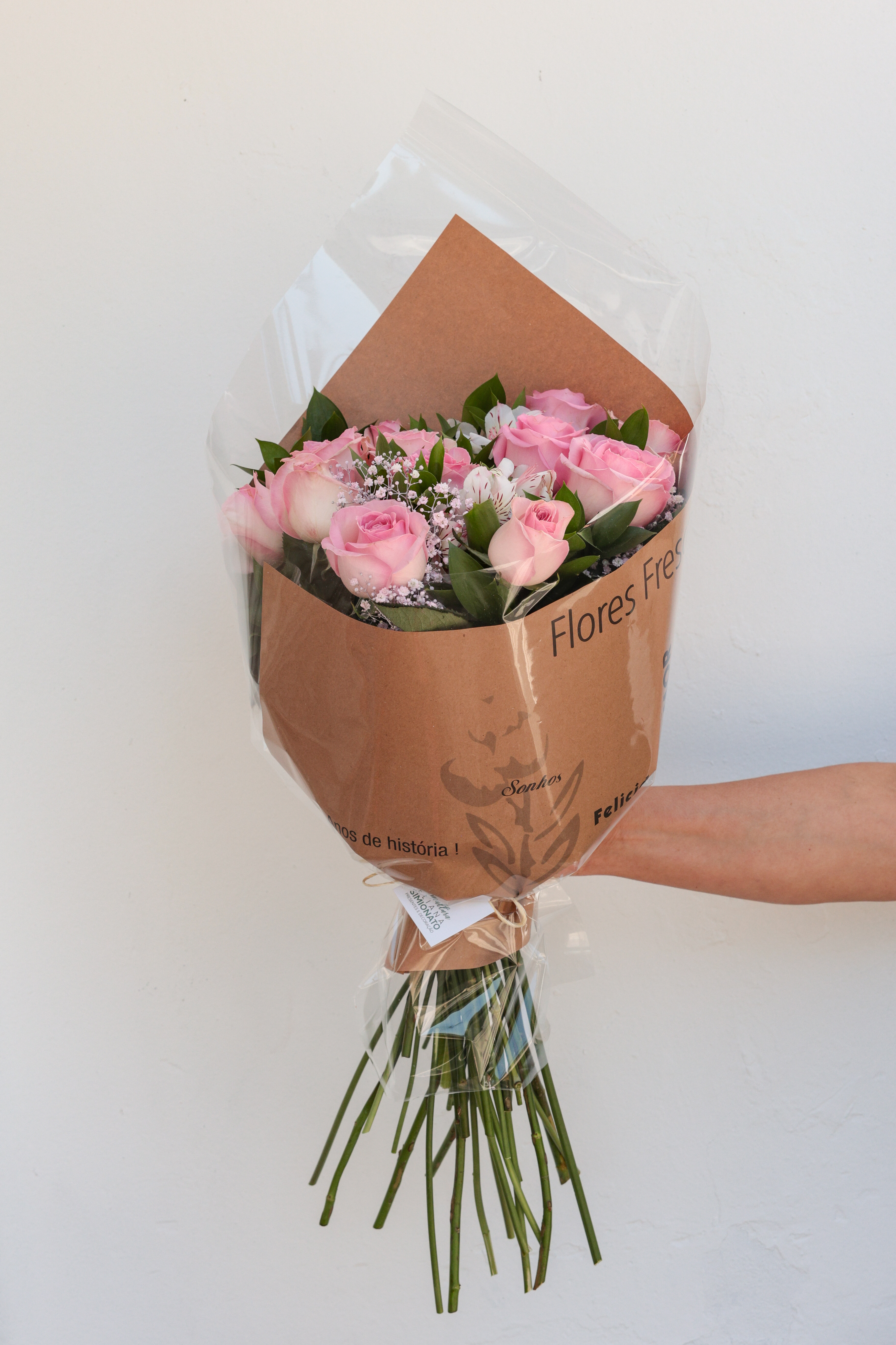 - Buquê com 12 rosas cor de rosa, delicado e romântico.
