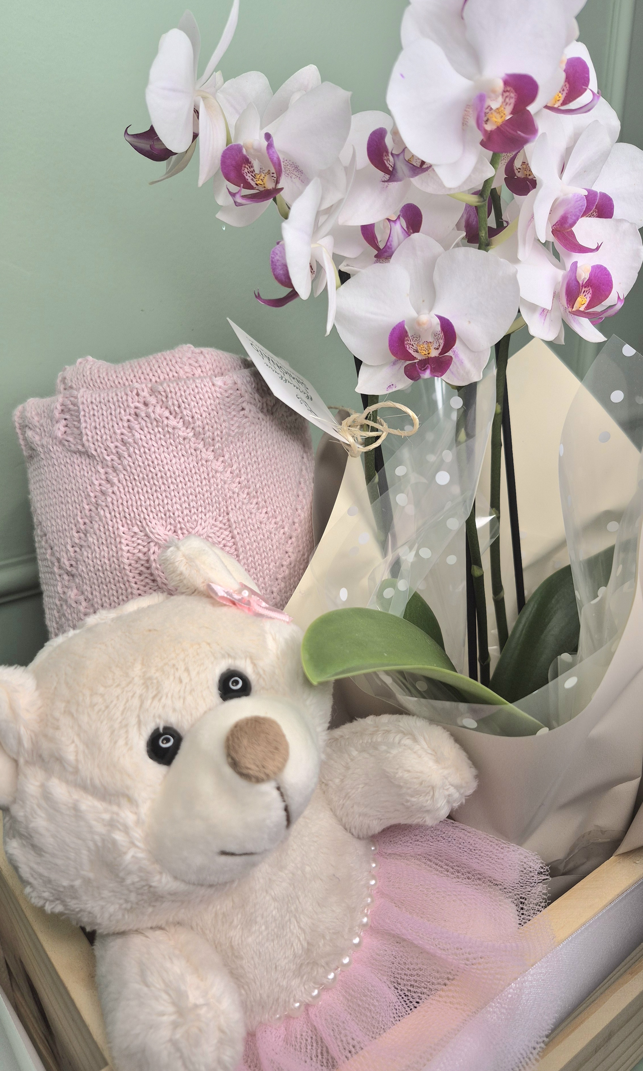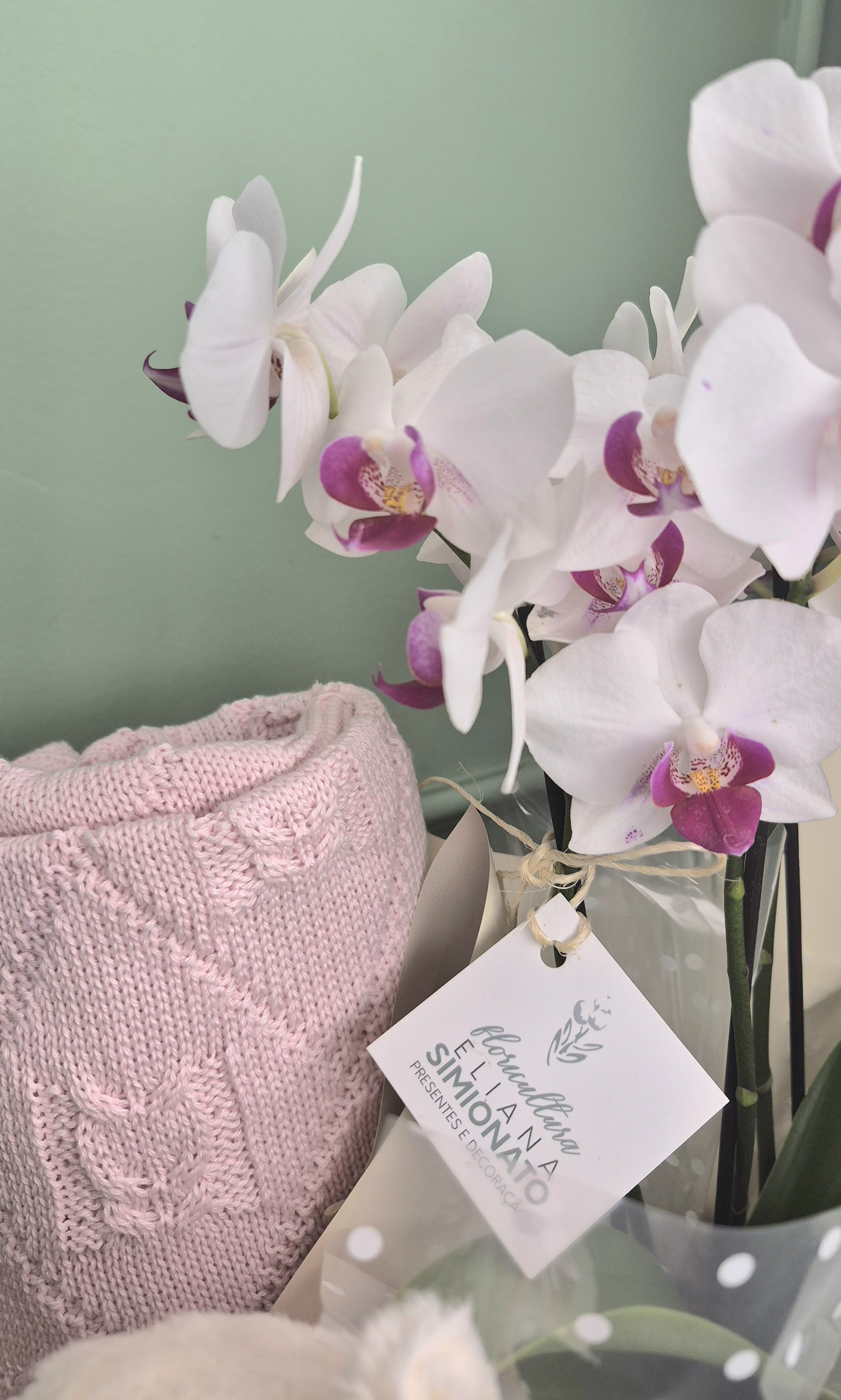 Um presente delicado para celebrar a chegada do bebê com carinho e encantamento. Nosso Kit Maternidade vem em um caixote de madeira e reúne detalhes que aquecem o coração: uma ursinha bailarina (daquelas que viram companhia e lembrança), uma manta rosa macia e aconchegante, e uma mini orquídea — elegante e cheia de delicadeza, perfeita para deixar o momento ainda mais especial.