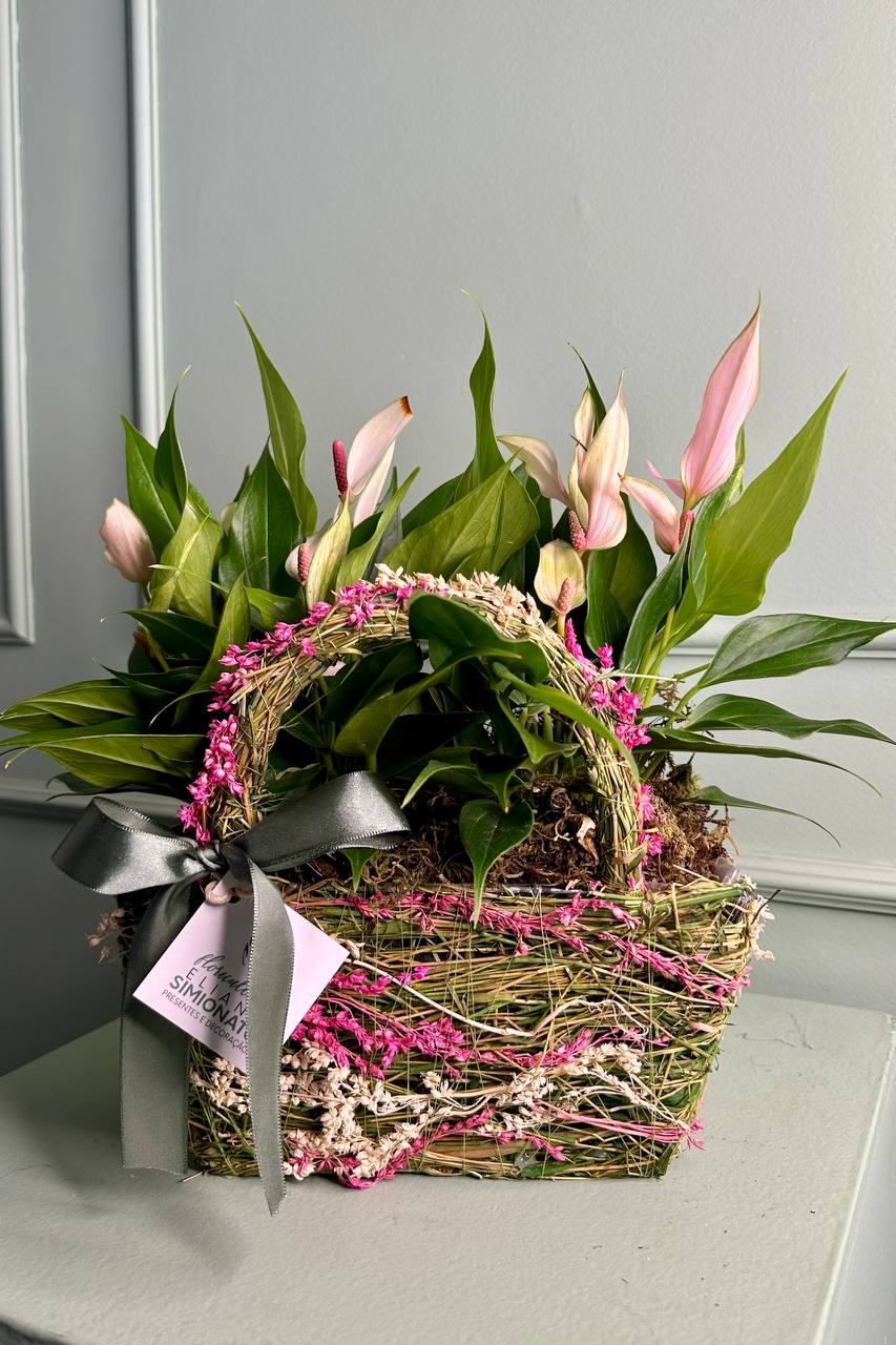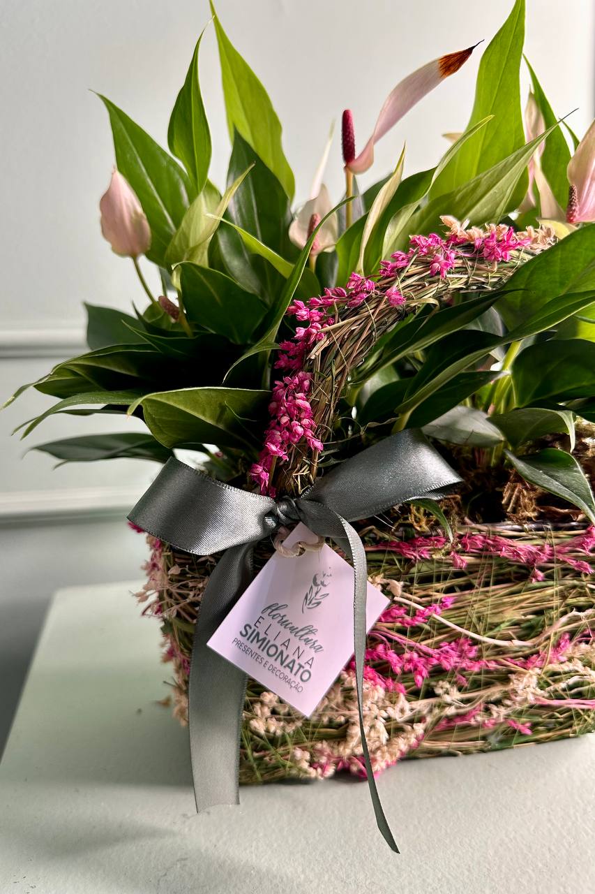O Mini Antúrio na Cesta Jardim é aquele mimo que transforma qualquer cantinho com delicadeza e presença. São dois vasos de mini antúrio rosa, cuidadosamente acomodados em uma cesta artesanal em tons de verde, com detalhes em rosa que deixam o conjunto ainda mais harmonioso e encantador.