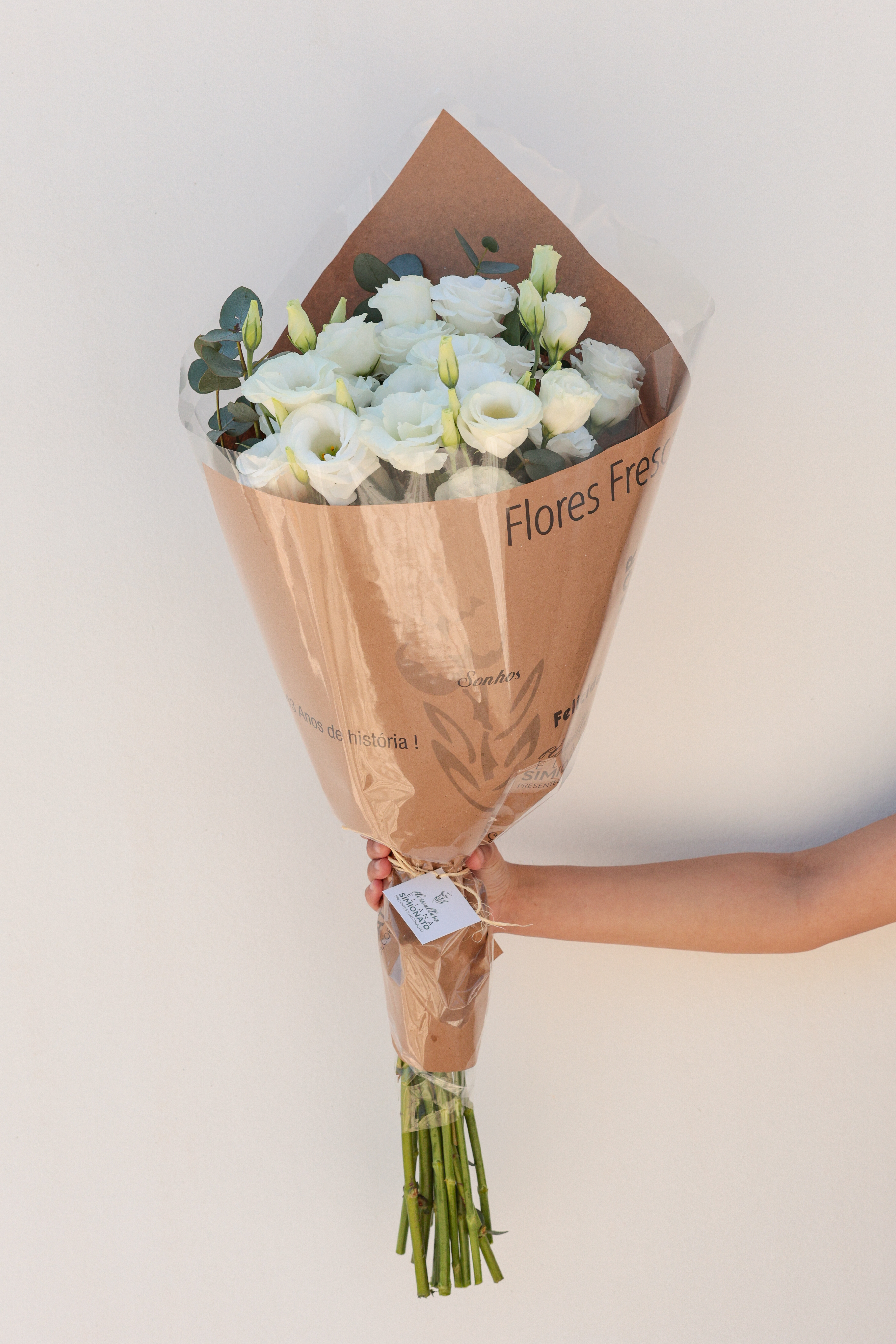 buquê grande de lisianthus branco da Floricultura Eliana é elegante e imponente. Suas flores delicadas em arranjo mais volumoso transmitem sofisticação e fazem deste buquê uma escolha perfeita para ocasiões especiais.