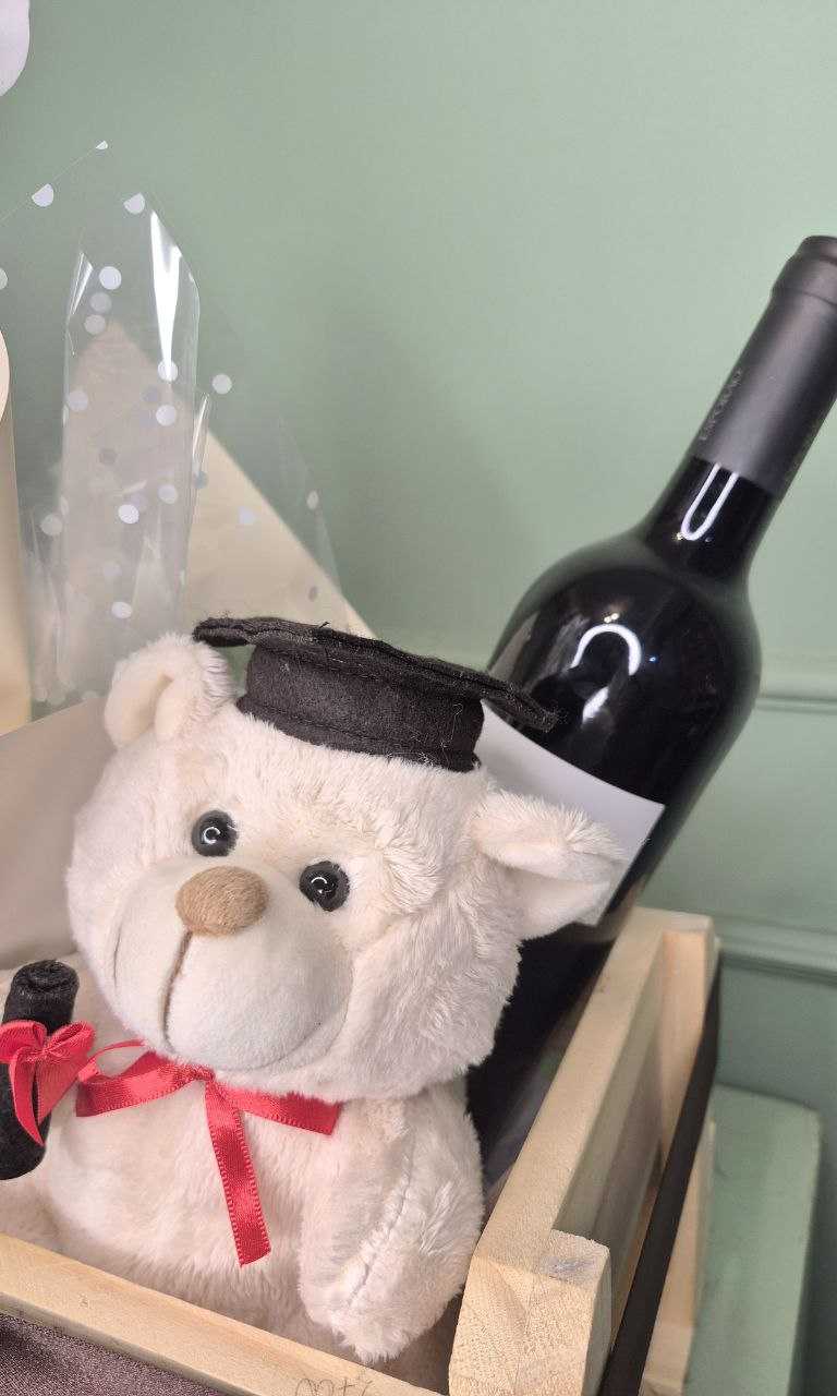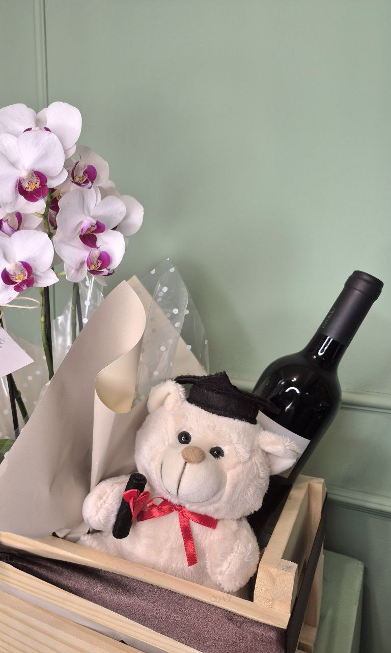 Um kit feito para comemorar uma conquista que merece brinde e memória bonita. O Kit Formatura vem em uma caixa de madeira cheia de charme e reúne detalhes que abraçam: um vinho tinto português Pé Tinto, jovem e acessível, produzido pela vinícola Esporão na região do Alentejo; um ursinho de formatura que vira lembrança afetiva; e uma mini orquídea, delicada e elegante, para acompanhar essa nova fase com beleza por muitos dias.